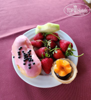 Выдавали один раз клубнику, каждому на руки)) Арбузы, дыня, яблоки были всегда. Мы не особо любим фрукты, поэтому для нас это было не особо важно. Несколько вечеров подряд был лосось на гриле, вкусный. Белую рыбу жарили, вкусная. Лепёшки всякие разные и очень вкусные. Десерты в целом тоже вкусные, брали те, что симпатизировали нам и пробовали по чуть чуть)