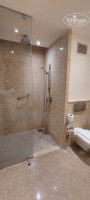 В санузле стеклянная перегородка и душ не совсем продуманы, вода брызжет на пол. Мыльно-рыльное добавляют каждый день - тюбики геля для душа, шампуня, кондиционера для волос и лосьона для тела. Качество на "троечку", а вот мыло кусочком понравилось.