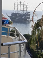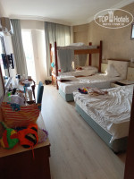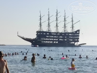 Приехали мы в отель чуть позже окончания ужина, сообщили об этом на ресепшн, нас тут же провели и покормили, мы даже столько не съедаем, сколько принесли. Попросили номер с видом на море, маленько сунули денег, но думаю, если б не давали, и нам не понравилось, переселили бы при наличии свободных номеров. Кондиционер в номере работал исправно, но дует он исключительно на кровать, раздвигали кровати, чтоб не так дуло, укрывались одеялом. В шкафу не хватало одной дверцы, но мы не привередливые, на качество отдыха это не влияло. Уборка в номере ежедневная, полотенца меняли и даже лишние не забирали, мы ими завешивали кровать двухъярусную, чтоб кондёр не дул туда. Питание так себе, конечно, но голодными не были. Ни мы, ни дети. Алкоголь крепкий, по моему, специально теплый, чтоб меньше пили. Вина вечно не было. Море очень близко, пляж самого отеля очень маленький и лежаки вечно заняты, мы ходили чуть подальше, там пляж то ли общественный, то ли какого-то отеля, но за лежаки просили деньги, мы и без них прекрасно обходились. За пляжные полотенца в отеле нужно внести депозит, а это 10$ на каждого. Об этом мы знали заранее, поэтому пляжные полотенца взяли свои из дома. Отель довольно бюджетный, но радовало, что до моря два шага. Недалеко базарчик, магазины. Анимации не было совсем никакой, один не очень трезвый турок включал детские песни, родители сами развлекали своих детей, через несколько дней еще и начал просить, чтоб танцевали и показывали движения. Во время прибывания проходил чемпионат Евро по футболу, после танцев включали проектор с матчами. На детской горке в бассейне нет ни одного рабочего, спасателя, родители сами контролировали процесс. Подкупила нас конкретно цена за две недели на четверых и близость к морю. Но в общем, если вы летите отдыхать, в не искать косяки отеля, для такой цены, вполне годно.