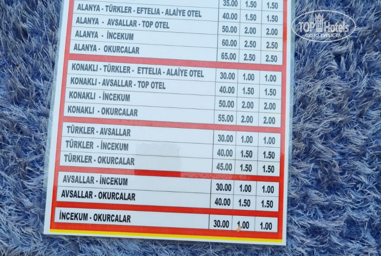 - стоимость автобуса от отеля до Аланьи - 60 лир с человека (1,5 евро, 1,5 доллара). стоимость проезда в городском транспорте 30 лир с человека. полный прайс во вложении