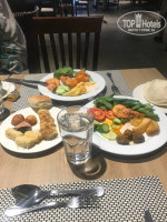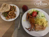 Ассортимент блюд разнообразный: крабы, креветки, говядина в разных исполнениях, мясо птицы (индейка и курица), колбасы, сыры (сортов 6, а то и больше), рыба разных видов. Все приготовлено в разных вариациях: жареное, на гриле, пареное, запеченное, фаршированное и так далее. Гарниры, салаты, овощи, соусы широкого ассортимента. Супы всегда 2 вида.