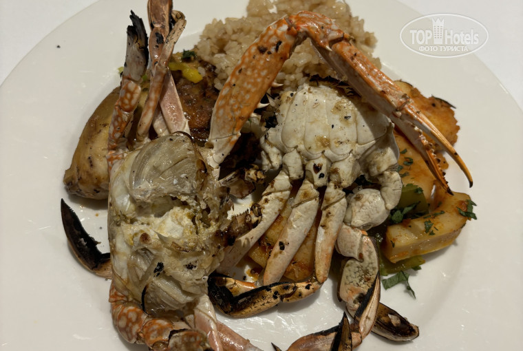 Еда очень вкусная. По началу мне показалось разнообразия мало, но потом мнение поменяла. Было основное: говядина (очень жесткая), курица, рыба. Рис, картофель, картофель фри, овощи, салаты. На гриле каждый день шашлык, или крабы, или рыба, или печень, или бифштексы. Фрукты каждый день яблоки, бананы, груши, апельсины, виноград, инжир, дыня. Выпечка и десерты.