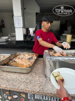 На завтрак через день либо блины либо пончики, если до 8:00 приходить, то никаких очередей за ними нет, если позже, то за яичницей и блинами либо пончиками очередь. Много разной зелени, овощей и сыров (однотипные, но есть можно). Разные булочки, джемы и шоколадно-ореховая паста (вкусная).