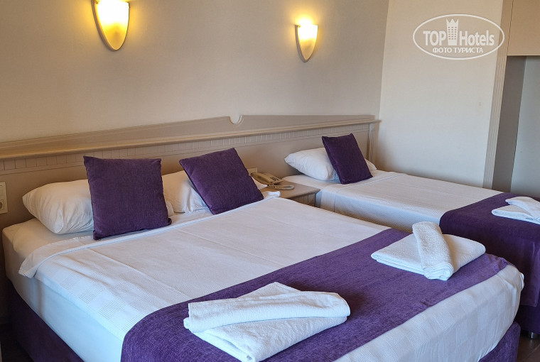 Шикарное расположение - прямо на берегу моря, территория просторная и очень зеленая, высокие пальмы, повсюду цветущая бугенвилия, красота!! Очень грамотное расположение объектов по территории - людей много, но нет скученности, ощущение простора. Очень понравился бар на пляже с перекусами - за пиццей и бургерами ежедневно дети бегали. Понравился широкий и достаточно протяженный пляж, на входе галька с песком, мы все спокойно заходили босиком. Лежаков хватало и на пляже, и у бассейна, без проблем находили свободные. Приветливый персонал, территория очень чистая, быстренько все убирают. Атмосфера в целом в отеле дружелюбная и приятная. Анимации днем почти не видели, но нас она и не интересует, всегда сами себя развлекаем. Вечером народ собирается за столиками у бара, играют в настолки или карты. По нашим ощущениям отель исключительно для семейного отдыха. По питанию - без изысков, но достаточно вкусно, десерты только не впечатлили совсем. И дети находили, что поесть, не только фри питались. А вот вино за ужином отвратительное. Из фруктов были арбузы, яблоки, груши, сливы, апельсины. По расположению в отеле поставила 4 из-за шума с дороги, мы были на 4 этаже, и с открытым балконом прямо шумно, возможно, на нижних этажах так не слышно было. А вот соседей по номерам совсем не слышали. Номер стандартный на 4ых маловат, считай только кровати помещались, но нам места хватало, в номере только ночевали и в обед на час-полтора прятались от солнца