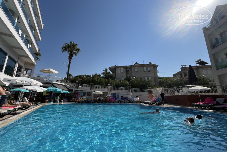 Отель находится на окраине Мармариса, но вся инфраструктура рядом - магазины, кафе, пляж, остановка общественного транспорта - всё не дальше 500 метров. Сам отель состоит из двух зданий и двух бассейнов. Свободной территории, зелени нет. Перед поездкой посмотрели видео на ютубе об отеле, где рассказали, что есть номера с плохим видом на соседние здания, где живут местные. При заселении положил 10 долларов в паспорт, и нам предложили на выбор как раз такой номер и номер на верхнем этаже с классным видом на город и море, и большим балконом. Выбрали, естественно, второй.