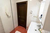 В санузле: душ в углу (с одной стороны стеклянная перегородка, с другой шторка), унитаз, раковина, фен, зеркало, шкафчик с полочками, под зеркалом выдвижные ящики. На полочках различные гели и шампуни. Также в санузле есть тёплый полотенцесушитель.