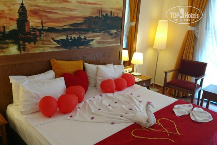 Заселение быстрое, номер нормальный, конечно не совсем современный но вполне нас устраивал, все чисто и аккуратно, даже украсили номер для молодоженов, подарок в виде фруктов и шампанского. Вид из номера потрясающий. Территория отеля небольшая и не маленькая, утопающая в зелени и деревьях, свежий хвойный запах с морским - просто кайф. Питание разнообразное и вкусное, мы были в восторге! Анимация в течении дня ненавязчивая, а вечером очень интересные выступления, нам нравилось. Море шикарное, пляж, песок-галька, вход в море - галька, мы не брали коралки, заходили так или с понтона. Вода прозрачная и теплая. Расположение хорошее, неподалеку расположены магазинчики и аптеки. Ездили своим ходом в Каньон Гейнюк, там шикарно! Обслуживание хорошее, все внимательные и улыбчивые. Отдых удался до сих пор вспоминаем с теплотой. Единственное уборка была не совсем качественная, под кроватью пыль была и вечером во время ужина были небольшие очереди, но это мелочи, так как общее впечатление исключительно позитивное. Надеюсь что сейчас все так же на высоте. Если появится возможность то обязательно сюда вернемся, но уже в другом составе)) для детей, кстати, тут тоже есть анимация и детский клуб, а также детское меню.