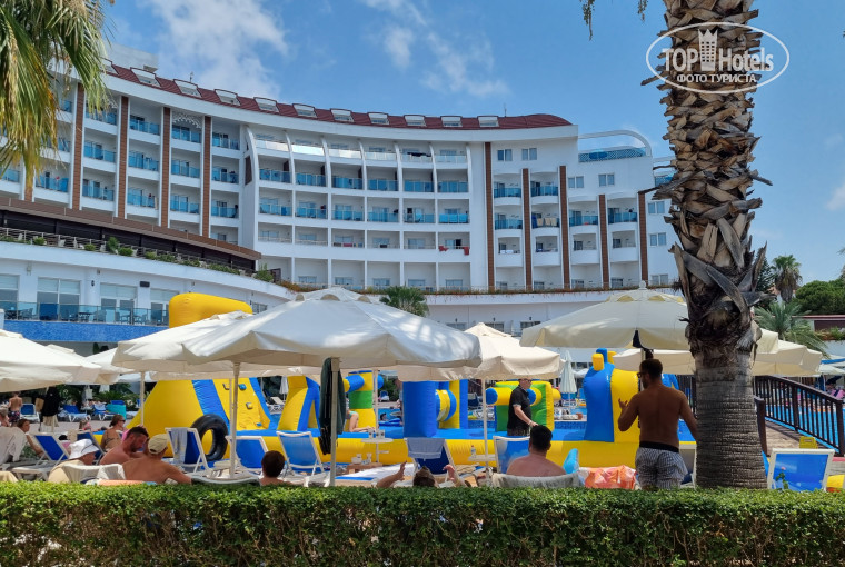 Пляж приличный, заход в море отличный. Это самый главный плюс. Песок правда не чистят и все курят. Лежаки занимают полотенцами, что у бассейна, что у моря. Придёшь попозже, мест нет. Или самые плохие места. Бассейн с горками неудобно расположен, нужно спускаться с довольно крутой лестницы или идти в обход. Но зато там мало народу за счёт этого. Горки для детей, маленькие.