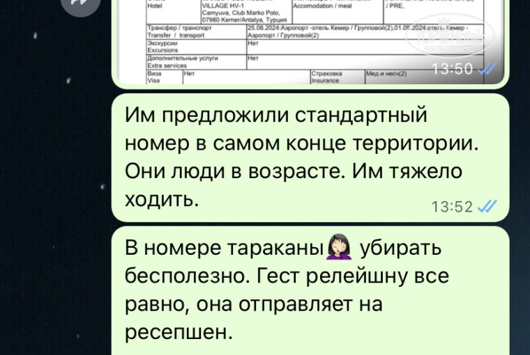 Туристы попросили поменять номер. Я написала команде гест релейшн,почему-то у них один номер на всю команду. Нашла номер Ибрагима Айдына в чатах для турагентов. Он даже не соизволил поздороваться. С командой гест релейшн у меня никогда не было подобных ситуации. Они всегда идут на встречу. Сказали свободных номеров нет. Попросила отправить комплимент в качестве извинений. Но в ответ получила "Вы что нами управляете? Не пишите мне больше!"