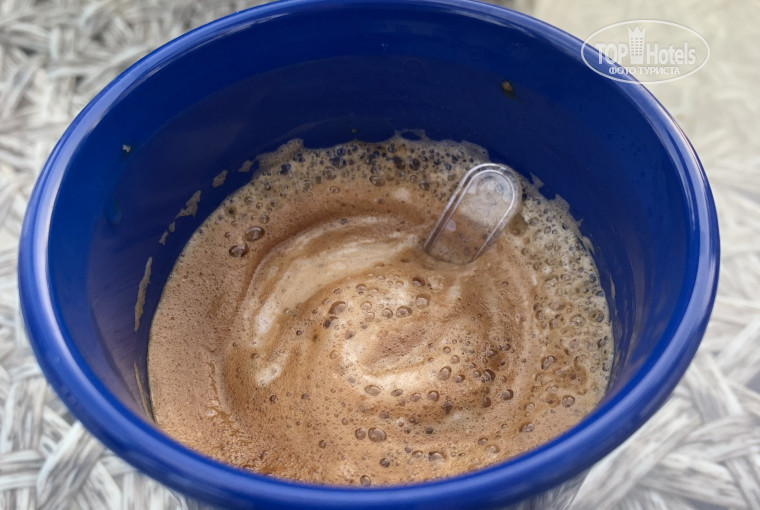 Номер. По номеру все отлично. Ремонт хороший, кое где огрехи, но вот это как раз вообще не принципиально. Главное чисто и уютно. Минибар с водой, соками, шоколадками и т.д. полный. Сразу скажу - уборка замечательная, причем не за деньги (хоть и оставляли периодически), а за совесть! Наш уборщик корпуса был просто умница. Спасибо ему огромное. Что не понравилось - полы покрыты керамогранитом и довольно холодные, особенно когда выходишь из душа. И вот тут у меня случился СТОП - мы же в 5***** отеле!!! И где мои тапочки одноразовые, брендовые? А халатик где я вас спрашиваю? Но к этому чуть позже... Пора чего нибудь пожевать. ОЛЛ ИНКЛЮЗИВ как ни как. Пошли на поиски "чего нибудь" где-то примерно в 17 - 17.30 и..... фиг что нашли! Спросили на предмет где пожевать на ресепшене - поищите в баре у пляжа нам посоветовали. Поискали и опять не повезло. Ну нечего пожевать, а глушить спиртное практически на пустой желудок я не привык. Ладно, изопьем хоть кофию в баре у пляжа. Сказано - сделано. Вот на фото есть чашка синяя пластиковая недомытая и липкая с тем, что так громко называется кофе! Вот честно, через пару часов нахождения в отеле я и моя семья захотели домой. Ну что делать, дождемся ужина.