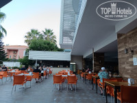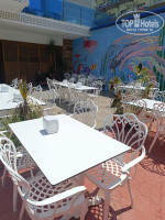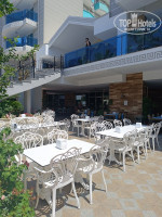 Теперь по пунктам. Территория отеля очень маленькая, плотность народонаселения отеля в июле достигла критической массы, чтобы возникла ругань за места в ресторане, на лежаках у бассейна, в очереди за мороженым. Думаю, что если отель маленький, не надо его уплотнять, ставя доп. места в номерах, потому что получается муравейник. Очень некомфортно. Территория настолько маленькая, что место есть только дойти до моря. Небольшое пространство со столиками под открытым небом возле ресторана. И всё.
