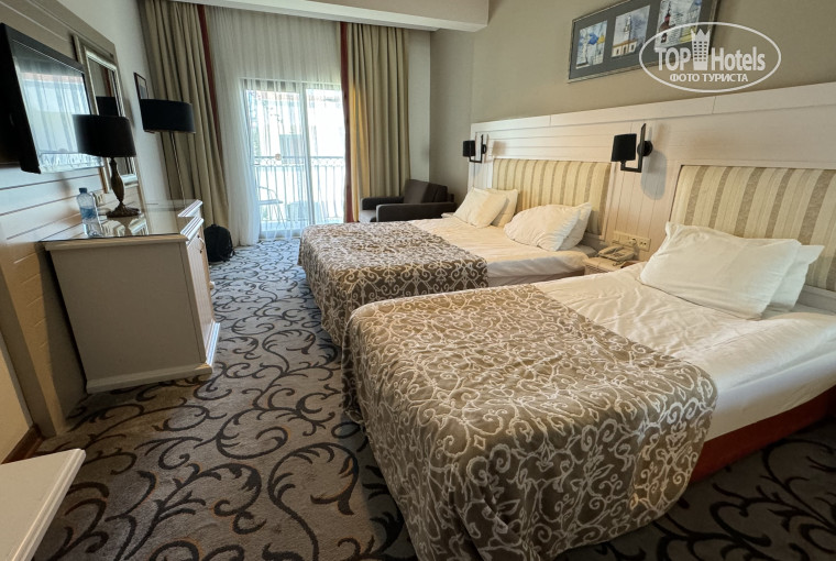 Отдыхали в этом отеле семьей из 4-х человек. На ресепшн замечательный вежливый персонал. Приехали к концу обеда, сразу одели браслеты, отправили в ресторан. После еды заселили в уютный домик, дали 2 соседних номера. Это очень удобно, огромное спасибо. Номер хороший, есть балкон с двумя стульями, столиком, сушилкой. Уборка нормальная, туалетной бумаги и мыльных принадлежностей всегда давали с избытком. Правда нет геля для душа, использовали в этих целях шампунь.