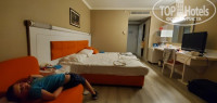 Приехали в отель в 9 утра, надеялись на быстрое заселение. Нам обещали заселить в 12.30, но по факту получилось заехать в номер в 13.15, при этом попросили замену номера, потому что номер был на соседний отель, где, как вулканы паром "дымили" какие-то кондиционеры, плюс разгрузочная рампа для грузовых авто. Попросили поменять номер и спасибо огромное - нам пошли на встречу, и минут через 40 мы заселились в номер на 5 этаже с видом на внутренний двор, сосны. Ресторан сначала не впечатлил разнообразием, видимо обедали под закрытие, но через пару дней мы были довольны: людей много, но залов несколько и места мы находили всегда. Питание разнообразное, мясо, макароны, выпечка, фрукты и прочее. Внизу есть рестораны итальянской, турецкой и др. кухонь, но мы до них не добрались, хватало основного. Для детей есть отдельный ресторан. Территория отеля чистая, ухоженная, много зелени. До моря близко - метров 75. Нужно пройти через бассейны, забитые немцами (никогда не понимал их, зачем ехать на море, чтобы с утра до вечера валяться у бассейна, что в Германии бассейнов нет?), небольшую полянку и попадаешь на пляж. На пляже тенты,что очень удобно, и лежаки. Проблем с лежаками нет, всегда есть свободные, т.к. немцы тусуются в бассейнах. Отдыхающие: немцы, турки, русские/белорусы, немного киргизов возможно кто-то еще, но их как бы и не заметно в общей массе остальных. Много отдыхает семьями с детьми. Пляж - супер! Мелкий песок, пологий вход, для детей - идеально. Кто любит понырять - есть плавающий понтон. Отдельно нужно сказать про пирс - он длинный, на нем много лежаков, можно купаться спустившись по лестнице. Есть бар. С него же ловят рыбу (это часть анимации). Развлечения. Для детей есть: Луна -парк с аттрацкионами: паравозик, колесо обозрения, карусели. Их не много, но в общем то и достаточно. На -1 этаже есть игровой центр для детей. Там игоровые автоматы: машины, мотоциклы, леталки на самолетах, стрелялки разные. Стоимость везде указана в кредитах. Стоит 1 -2 кредита. Покупаешь карту за доллары / евро/ лиры - на карту начисляются кредиты. Например, 9 долл. = 13 кредитов, Чем больше зачисляешь, тем выгоднее. Для игры - приложил карту к чипу - с нее списали кредиты, показали остаток на карте. Тоже и в Луна -парке. Только аттракционы дороже. Внизу на улице возле бассейнов / амфитеатрв есть бары, суши -бар, пиццерия, гамбургер - бар, мороженое и прочее. Смена пляжных полотенец работает до 19.00. Замена по картам. Сдал -получил.