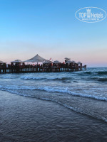 От отеля до пляжа пешком около 7-10 минут, либо на трансфере (ездят каждые 3-4 минуты). Пляж большой, песчаный, чистый. Лежаков много, приходили и днем, и вечером - свободные находили без проблем. Заход в море пологий, метров через 30 от берега глубина 2 метра. На глубине чуть выше пояса и около пирса соседнего отеля (слева) - острые камни. Очень здорово, что есть 2 ресторана, в которых можно полноценно пообедать (пицца, супы, горячее, салаты, десерты, мороженое, гезлеме). Днем проводят различные активности - волейбол, дартс, бочче.