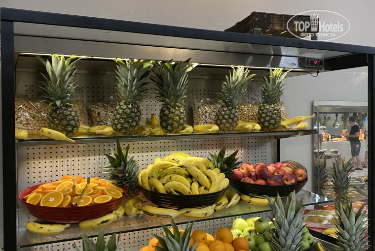Из фруктов все по сезону, много персиков,дыня, арбуз, вкусные бананы, даже была клубника,ананас, манго, кокос.