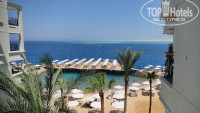 4. Пляж. Пляж расположен очень близко, буквально надо выйти из номеров и спуститься на первый этаж. Приятный мелкий песок, теплое чистое море, огороженное искусственной лагуной. Можно поплавать с маской и посмотреть на рыб, которые плавают недалеко. Есть также спуск с другой стороны лагуны, на более открытую часть моря. Лежаков много, зонтов тоже, все довольно компактно расположено. Но если отель сильно загружен, то в пиковые часы трудно найти место под зонтом. Можно попросить персонал перенести свободные лежаки в тень здания на траву. Если не хотите, чтобы вас беспокоили продавцы -- вместе с полотенцами берите красный флажок и вешайте его на видное место. На пляже работают официанты и предлагают напитки. В нескольких местах есть туалеты, открытые душевые, кабинки для переодевания.