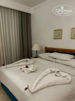 Белбой отнёс наши вещи в номер прямо до номера, показал как пользоваться сейфом, входной ключ-картой, как включать кондиционер, как открывать дверь на террасу ( естественно за небольшой комплимент в виде $ ). Сам номер, как писали многие, скорее уставший, но жить можно с комфортом. Отличные кровати ( удивились что их две: 1 большая двух-спальная, и 1 маленькая рядом, но маленькую использовали под бытовые вещи( полотенца, одежда и т.д.) Шкаф большой и удобный, вешалки ПРИКРУЧЕННЫЕ ( кто понял, тот понял) , место под чемодан, и много-много-много полочек под различные нужды. Тумба под телевизором с холодильником, тумбы около кроватей , так же с большим количеством полочек. В номере есть телефон, по которому можно позвонить на ресепшен 24/7 . Люстр нет, освещение только лампами на тумбах ( всего их 4 штуки) . В ванной лампа в потолке, но и этого вполне достаточно . Ванна , душ. Но ванна пластиковая ( или что-то такое, мы так и не разобрались) , очень сильно прогибалась . Есть полочка под ванные принадлежности в стене. Раковина с огромным зеркалом( всего их в номере два) . Терраса с видом на бассейн, со стеклянным столиком, и двумя креслами. Есть пепельница .