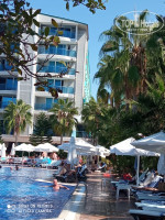 Заезд. Приехали около 10 вечера. Ключ дали сразу, но номер изначально не был пригоден для проживания. Кондей не работал. Душ сломан. Волшебная 20-ка решила все проблемы за 5 минут. В результате заехали в номер с великолепным видом на море, новым кондеем, исправной сантехникой, с зеркалом на пол-стены и с двумя электронными ключами. Жили во втором корпусе. Если смотреть со стороны моря, слева. Чётные номера. Начинаются с 2. Взятка, конечно плохо, но в Турции это нормально. Хотя, справедливости ради, скажу, что мы познакомились с туристами, которым номер поменяли бесплатно.