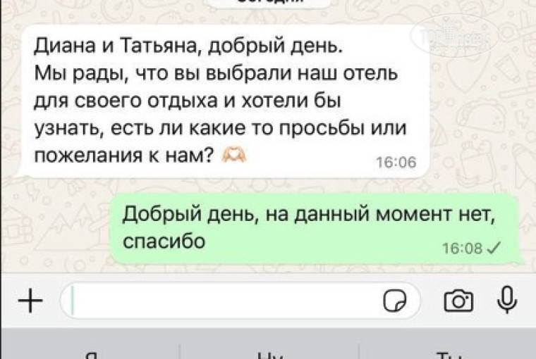 Отзывы мы удалили, чтобы от нас наконец-то отстали (на встрече нам предлагали встретиться еще раз...видимо, если не надумаем и не удалим отзывы, то нас бы точно выселили, так как время для повторной встречи предлагалось подозрительно близко ко времени чекаута...). Встреча кончилась, подруга в слезах от пережитых стрессов, мы вообще не можем успокоиться, и о чудо!!!!)) Катерина в своем сообщении сразу после "встречи" предлагает бесплатный массаж...ну ребята, это просто какое-то издевательство, а потом еще несколько дней нам строчат непонятные сотрудники отеля с вопросами, все ли у нас хорошо (скрины также прилагаю)...