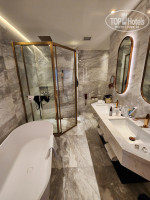 Очень просторная ванная комната с ванной, душевой кабиной и современным японским унитазом Toshiba с кучей функций. 2 раковины. Ванная не очень удобная, слишком резкие бортики, не полежать. Горячая вода была всегда. В ванной комнате есть все необходимые мелочи – зубные щетки, мыло, шампуни, гели, бритвы и т.д. Всё хорошего качества.