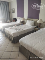Прилёт у нас был поздним, по приезду нам сразу надели браслеты и отправили кушать. Номер был с тремя кроватями. Многие писали, что старая мебель. Мебель-то может и не заметно, что старая, а вот в ванной плитка уставшая, силиконовая замазка везде. Светильники тоже очень уставшие, один стоит с опорой на стенку (на фото видно) и очень грязные. Тюлевая шторка грязная и в дырках. Уборка в номере заключалась только в укладке использованных полотенец, шампуней и бутылок воды. После покупок экскурсий у гида нам пообещали крутую уборку. В результате хоть с пола мусор убрали и накрутили одну фигурку на кровати. Больше фигурок не видели, но мы и чаевых не оставляли. Звукоизоляция в номере никакая, так как в соседний номер есть дверь, и вот через неё всё слышно. Уборщики разговаривают, включают музыку, как будто в твоем номере находятся.