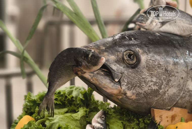 На пляже полноценный ресторан, каждый день была дорадо) шампанское, пиво и тд)