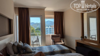 Отдыхали парой в сентябре с Пегасом. Прилетели с Азур-эйр, самолет душный и не комфортный. Приехали в отель вечером на микроавтобусе. Лихо доехали от аэропорта, максимальная скорость была 127 км.ч., за всю поездку от Анталии до Кемера никто нас не обогнал, не перевернулись и за то спасибо. Номер сразу выделили на 4 этаже, но без реновации (в итоге оказалось с реновацией), мебель не очень свежая, но не ушатанная. Большинство номеров в отеле с реновацией (по факту оказалось наоборот, у соседей ламинат и он вздувшийся). Вид у нас был на горы и на мусорку, так не критично, но в 5 утра приехала мусорная машина и начала греметь бьющимися бутылками. Петухи поют с 2 утра. Сон конечно с открытым балконом, на дворе же сентябрь. Кондиционер работает хорошо, но включался редко. В холодильнике 3 бутылки простой воды и 3 минералки.