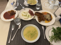 4. Рыбный а-ля карт приятно удивил. Подавали суп с морепродуктами (которых много!), горячую закуску, холодные закуски, сёмгу со шпинатом и на десерт- пахлаву с мороженным 👏. Здесь молодцы! (Странно, что нет на выбор турецкого а-ля карт, нам объяснили, что конец сезона, из-за этого… но если отель принимает туристов и за немаленькие деньги , о каком закрытии сезона можно говорить?)
