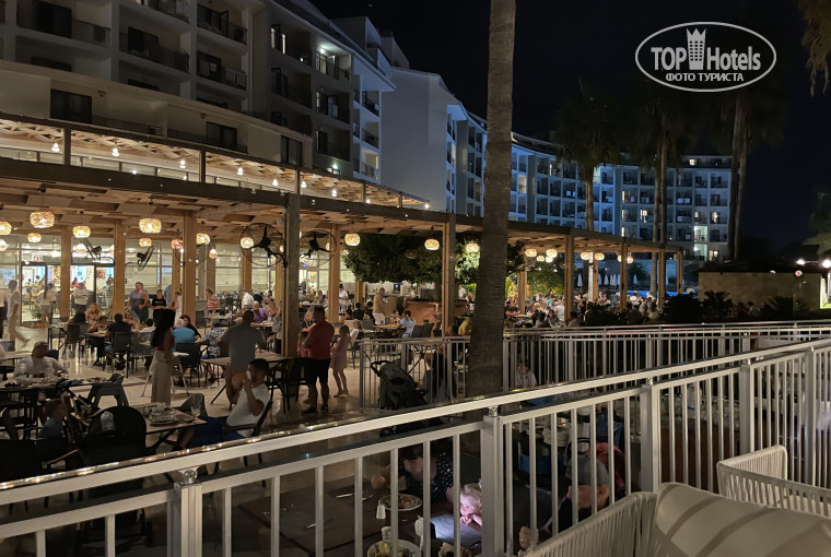 Еда. С голоду конечно не умрете, но скромно. Первый раз столкнулась с таким скудным количеством фруктов - яблоки, цитрусовые, сливы, бананы. Когда давали виноград- его тут же сметали. Один раз за всё время видела груши. Всё. Привычными арбузами и дынями даже не пахло. Не говоря о чем то большем. Обслуживания официантов за обедом/ ужином дождались за всё время раз 6, в основном они успевают только всё убирать, а хочешь пить- сходи сам. Мороженное дают в баре на пляже с 11 до 16. Не смотря на то что на территории есть кофе хаус- вкусного кофе вы тоже не найдете. Алкоголь наливают в пластиковые стаканчики, притом иногда даже в лобби. Импорта нет. Гид сказал - требуйте в лобби, но ни мартини, ни апероля мы с барменом так и не нашли😳