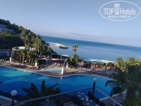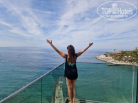4) Сам отель стоит на возвышенности, на территории 3 лифта, один из них к морю-это отдельное удовольствие. Территория просто невероятно красивая, отель на горке стоит, из-за этого виды просто невероятные, закаты алого цвета каждый день. Браслеты в отеле не выдают (руки ровно загорят)) полотенца всегда в наличии, бери сколько хочешь , карточек на них тоже никаких нет. Аля карт 4 штуки, за каждые 5 ночей турf положено бесплатно один раз сходит в любой из них на ужин, мы выбрали Итальянский, там красивый обзор.Паста невкусная, мы после взяли ризотто с мясом и это восторг! Очень понравилось блюдо, у нас так не готовят.Аля карт нужно бронировать заранее, бронь открывается в 10:00 , но прийти нужно в 09:30 чтобы забронировать то, что вы хотите, иначе пойдете туда что останется, мы хотели именно в Итальянский, забронировали его только прийдя заранее, в 10:00 утра народу уже много и большинство бронируют именно его.В целом питание отличное, все есть, рыба, мясо всегда подают, овощей и сладостей полно, голодным остаться невозможно.Днем у бассейна готовят крошку картошку и венские вафли, там и мороженое каждый день раздают.Алкоголь нормальный, мы пили в основном Апероль и вина белое/красное, наливают из бутылок, из пакетов не льют, как в некоторых отелях, крепкое тоже все есть, я не брала , писать про него не буду, но многие пили и жалоб не слышала.Единственное, что коктейли они не умеют делать, намешать могут только как вы сами попросите. Насчитали 7 баров на территории, 1 в лобби круглосуточный.