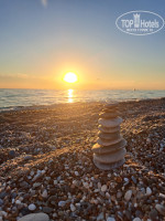 На пляже поддерживают чистоту и порядок. Везде есть корзины для мусора. Также регулярно ходят, собирают мусор. Лежаков и матрасов всегда нам хватало, в 7 утра не занимали. Вход в море кому-то может быть трудным, галька мелкая. Мы аквашузами не пользовались, воспринимаю такую гальку как массаж ног. Мои родители тоже входили выходили без особых проблем. Глубина увеличивается постепенно.