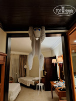 30го декабря вечером приехали в отель, сразу нас заселили в просторный двухкомнатный номер с видом на бассейн и боковым видом на море. Нас все устроило. Мебель в номере старенькая, но мы роскоши и не ждали. Зато было много подушек, одеяла и мягкая кровать. Одному ребенку дополнительно принесли раскладушку. Потом еще выяснилось, что эта сторона (левое крыло, если идти от ресепшен) всегда на солнце: мы и рассвет встречали и вечером солнце до последнего заглядывало к нам в окно. Это было здорово, в номере тепло, учитывая сезон. На другой стороне всегда была тень. Думаю, что там было бы не комфортно жить.