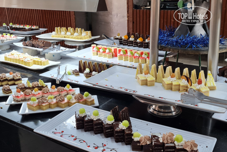 Сладкий стол,также всего много,но одно и тоже разными кусочками порезано,торты большие вкусные,десерты в стаканах разбрают быстро их всего 20шт на всех и больше не приносят