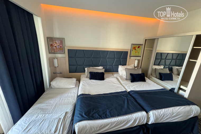 Бронировала номер на 2 взрослых и ребенок 3-х лет. Указала, что понадобится дополнительная кровать. В момент заселения свободных номеров не оказалось и меня отправили в номер для инвалидов. Номер очень маленький и на вопрос, а где будет спать ребенок, мне ответили, что принесут доп кровать. Естественно я сразу поняла, что ставить её некуда, но они впихнули ... Получилось одно сплошное спальное место к которому нельзя подойди ни с одной стороны, так же не было подхода к шкафу. Меня это сильно разозлило!!! Но отношение персонала отеля меня разозлило ещё больше!!! Мне не хотели предоставлять номер за который я заплатила! Гест менеджер наглая турчанка, просто сказала, что номеров нет и делала вид, что меня нет в помещении. 3 часа я просидела с 3-х летним на ресепш. Естественно ни менеджера, ни директора мне ни кто не пригласил. У гидов из Coral я выяснила, что в соседнем корпусе есть главный по размещению, пошла туда, объяснила ситуацию, показала фото. Через 2 минуты мне сказали, что для нас нашли номер на 6 этаже. Номер был старый, из душевого поддона вода вытекала в коридор и мы постоянно наступали на хлюпающий ковролин. Естественно обращение на ресепшн ничего не изменило. Постельное бельё старое, с дырками. За 5 дней убрали 1 раз в самом начале, потом даже мусор не выносили. Под столом около мусорки образовалась гора от пластиковых бутылок из под воды. Ресторан очень маленький, я даже сначала не поняла, что это основной ресторан, подумала, что что-то типа буфета, перекусить. Еда самая обычная, без изысков. Дорога до пляжа проходит между двумя футбольными полями (для кого эти поля не понятно, ни разу там никого не видела) Пляж широкий, песчаный, вход пологий. Лежаки в ужасном состоянии, матрасики не моют. Ну и вишенка на торте - это бар на пляже! Киоск на пляже, где с одной стороны разливают пиво и кока-колу, а с другой жарят вонючие бургеры. Коктейлей на пляже нет, как и любого другого алкоголя кроме пива. Полноценно покушать на пляже у вас тоже не получится.