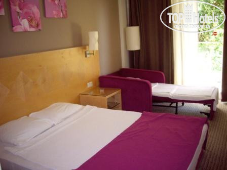 Разместили в 8 корпусе. 8 и 9 корпуса ближе всего расположены к морю. Номер стандартный, довольно уютный, прекрасный вид с балкона. Душевая кабина (в девятом ванна). Большой минус это душ, который вмонтирован в стену и, никак не регулируется. В наличии только жидкое мыло, шампунь, шапочка и штопальный набор. Телевизор с тремя русскоговорящими каналами. Очень порадовало наличие больших зеркал в номере. Уборка ежедневная, постельное белье меняли часто, полотенца - по мере их загрязненности, проблем не было. Спасибо горничным - номер всегда выглядел идеально. Есть мини-бар, пополняется 2 раза в неделю, вода ежедневно. В наличие два вида сладкой газировки, 2 маленькие бутылки минералки, сок в 2 маленьких пакетах, большая бутылка воды.