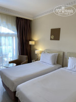 Прилетели рано утром, предложили попить кофе с круассаном, у нас с собой были бутерброды. К 11 часам одели браслеты и дали номер в 6 корпусе, у бассейна. Номер нас устроил, чистый, вид из номера нормальный. Как потом оказалось не работал сейф и холодильник. Сообщили гастроляйшен, пришел работник, поменял батарейки и сейф заработал. Холодильник просто вынесли и занесли работающий. Для кого-то случилась бы трагедия, для меня, если проблемы решаются, то это плюс отелю. Пришел уборщик, спросил нужно ли чего. Попросили у него халаты.
