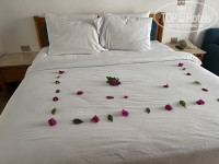 У супруги был день рождения, она специально никому не говорила. Когда пришли с пляжа, увидели в номере украшенную кровать. Очень приятно ей было, что отель это не оставил без внимания, а через некоторое время пришел работник из ресторана и принёс небольшой тортик с приборами. Кстати, кровать украшали живыми цветами почти каждый день.