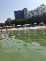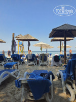 Пляжные полотенца выдают при входе на пляж, в любом количестве. Лежаки бесплатные, есть душ, туалет, в баре напитки - чай, кофе из кофемашины, кола, спрайт в банках, вода.