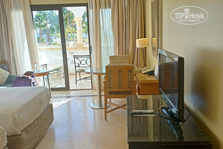 Номер. Мы жили в 8 корпусе. Он большой: две отдельные кровати (что-то между нашей 2 и полуторкой), тумбочка, комод, стол, топчан, пуфик, два шкафа (вешалки есть - штук 10). ванная комната - большой умывальник, душевая кабина, ванна, туалет там же за матовой дверью (освежителя нет, вытяжки тоже), стандартный набор - шампунь, бальзам, гель и молочко, шапочки и мыло, полотенца по 2 - банное и лицевое, для ног не было. Из оборудования в номере - минибар с водой (пополнялся раз в день по 2 бутылки), утюг и гладильная доска, фен (правда нашли мы его в комоде, шнур протянут через заднюю стенку в розетку), сейф бесплатный, кондиционер рабочий, телевизор (мы нашли два русских канала - ТНТ и с фильмами - 7 и 10 вроде), чайник с набором чай/кофе/сахар. Большой балкон - пара стульев с подушками, стол и топчан. Вид ну почти на море))) - то есть через крышу соседнего корпуса