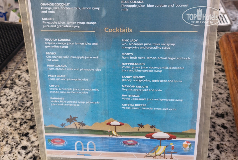 Алкоголь достаточно хорош, с учетом того, что в All Inclusive входит только местный алкоголь мы были приятно удивлены его качеством. Крепкий алкоголь разливают из бутылок. Виски и текила отдают анисом, по вкусу приятнее всего оказался ром, он без анисового привкуса. Разнообразие напитков большое, большая коктейльная карта. Коктейли приличные, если мохито, то как полагается и с мятой и лаймом. Бармены алкоголь не жалеют и наливаю сколько попросишь, что конечно сильно зависит от времени суток и усталости бармена, но в целом они очень отзывчивые и стараются даже под конец рабочего дня.