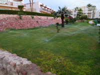 4) Территория Sport в большей частью покрыта разными площадками: футбольное поле, теннисный корт, ипподром для лошадей, волейбольная площадка, помещение с тренажерным залом, сауной и джакузи, шатер для анимации, большой бассейн с несколькими горками. Наш бассейн был единственный обогреваемый. В бассейне также играют в водное поле и водный волейбол. Зелень присутствует, но как-то очень простенько и скудненько. Для красивых фото надо идти в отель Front, там с зеленью всё в порядке.