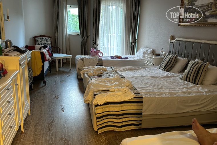 НОМЕРА – наш вариант размещения двое взрослых и ребенок. Заселение строго после 14 часов. Заселили нас не с первого раза, первым дали номер на гудящее оборудование, толи кондиционера толи еще чего-то и с видом на это оборудование с балкона, т.е. вместо спокойного, красивого вида на сад, нам предстояло 10 ночей «наслаждаться» такой «красотой». По запросу номер нам заменили с большой неохотой, с видом на главный вход и фонтан, в принципе было не плохо (громкой музыки и других развлечений слышно не было). Номера стандартные (нам остался вариант -двуспальная кровать и две односпальные), немного убитые, убирались отвратительно, но это, к сожалению, бывает часто. Бар пополняли через раз, так же, как и средства для душа.