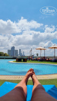 Бассейны суперские, их 3. Большой и глубоки. Там с музыкой, много места и людей. Лежаки заняты ещё до завтрака. Накрывают полотенцами и не приходят. Мы убирали полотенца и чилили, а если люди приходили, переходили на соседние "занятые" пустующие Лежаки. По другому никак. Дальний бассейн тихий, теплее и чище, но там прям релакс. Вечером на закате очень романтично. Плюс ещё на 4м этаже есть бассейн, на крыше выступа, вид на море. Там вода холоднее и ветрено, но есть лаунж зона, очень милая. Локации для фото супер. Везде есть бары, где можно поесть и попить. Коктеои делают отличные, по рецептам и грамовке.