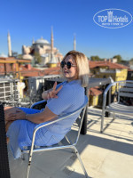 По приезду заселились очень быстро) вежливый персонал. Очень удобное расположение отеля. Над номерами кафе для завтраков с шикарными видами на ВСЕ достопримечательностями! Панорамный вид на Босфор! Завтраки турецкие) можно позавтракать на свежем воздухе, на крыше терасса с шикарными видами) рядом множество ресторанов, баров, кафе, на любой вкус и кошелек) В отеле спокойно, так как с утра до вечера все на прогулках)) Выходишь с отеля и в пешей доступности, в нескольких минутах дворец Топкапы, Ай София и множество других достопримечательностей! Вечером можно спокойно прогуляться и насладиться турецким колоритом) При выходе с отеля прям напротив есть магазинчик продуктовый. В отеле ребята дают экскурсионную карту и подсказывают тем кто в первый раз(как мы) что и где посетить) Подведу итог) для краткосрочного прибывания отель хороший,расположение супер, ребята вежливые!