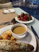 Приехали до обеда , сразу отправили покушать, еда здесь с 5 утра и до поздней ночи. Отель в стопе, но места всем хватает, есть столы в ресторанах под кондиционером, свежо, и на улице где очень живописно-везде цветы и красивая архитектура. Питание нам понравилось, мы очень любим рыбу: скумбрия, анчеусы, селедка, кефаль, дорадо, кальмары и креветки. ходили во все рестораны 4* и 5* везде примерно одинаково, в 4*Пикальбатрос аква блю рыбный ресторан-супер. Прогуливаясь по ресторанам получилось так что мы каждый вечер были с клубникой и креветками.