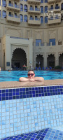 Итак, мы с мужем отдыхали в Bahi Ajman Palace в марте 2025 года. Мы не самые привередливые туристы и нам в целом все понравилось! Отель на первой береговой линии, от аэропорта ехали около часа, но, по-моему, большую часть стояли в пробке, так как прилетели вечером и в Рамадан после захода солнца и начинается вся "движуха". Напротив отеля есть множество магазинчиков, ресторанчиков и кафе. Если, выйдя из отеля, повернуть налево и пройти вдоль Fairmont, Ajman Beach Palace, Ajman Saray, перейти на противоположную сторону, то попадаешь к Ajman Marina, где в Рамадан очень красиво, множество ресторанов, фудкорт и т.п. Направо от отеля минутах в 10 ходьбы общественный пляж, там здорово погулять вечером и полюбоваться шикарными закатами. Теперь об отеле. Мы приехали вечером, поэтому номер получили сразу. Достался с видом на город и боковым видом на залив. Мебель в номере старовата, но все целое. Много ящиков, тумбочек, полок, была даже мини-гардеробная. Wi-fi работал отлично на территории всего отеля и на пляже ближе к бассейну и отелю. Также в номере был большой телевизор с доступом к YouTube и интернету (смотрели по вечерам фильмы), утюг и гладильная доска (не нужно было просить отдельно на ресепшен, как в некоторых отелях, даже 5*), чай-кофе в достаточном количестве и несколько видов (чай, например, был Earl Grey, зелёный и ромашковый), белый и коричневый сахар и сахарозаменитель, вода в стекле), постельное белье белоснежное и без катышек, очень большое, но лёгкое одеяло (прям, как я люблю!), вполне удобные подушки. В санузле, кроме душевой кабины, ещё и достаточно большая ванна, есть все необходимые средства гигиены: гель для душа, кондиционер, шампунь, лосьон для тела, зубные щётки, паста, шапочка для душа и т.п. Много полотенец, халаты тапочки - все белоснежное, чистое, мягкое и благоухающее. Кондиционер в номере центральный - включить/выключить в номере можно, отрегулировать нельзя. Уборка и пополнение расходников в номере ежедневно, только в разное время (иногда утром, иногда в обед). Убирали неплохо. Не понравились только грязные окна в номере, но, наверное, их там и мыть бесполезно. Персонал отеля вежлив, улыбчивы, услужлив. Все возникающие вопросы решали оперативно, эффективно и максимально доброжелательно. Есть русскоговорящий персонал. Территория самого отеля маленькая, но уютная и зелёная. Бассейн подогреваемый, маленький, но нам хватило. Есть детский "лягушатник" под навесом и "типа джакузи" под открытым небом. Пляж небольшой, чистый, песчаный, вход в море пологий. На камнях волнореза справа от пляжа много крабов (даже больших и страшных), приплывают какие-то рыбешки, но любителям подводной флоры и фауны не сюда (в этом плане, Египет лучше), а таких не слишком профессиональным пловцам, как я, море здесь понравится. Лежаков хватало всем, чтобы занимать ни свет-ни заря не было и речи. Слева от пляжа стройка, строят волнорез, но лично нам ни на пляже, ни в номере она особо не мешала. Море чистое, иногда приносит к вечеру мусор, но его за ночь убирают и утром море вообще идеальное. Никаких запахов солярки, пятен мазута, как писали некоторые в других отзывах здесь, мы за неделю отдыха не увидели и не почувствовали.