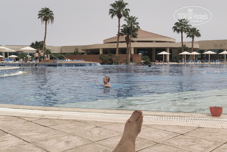 Территория отеля очень зелёная не характерная для египетских отелей. Великолепный газон, в шаговой доступности все необходимое, для малоподвижных можно вызывать бесплатный голь-мобиль. Хорошая волейбольная площадка с привозным, белоснежным песком, но зачем под ним бетон (прощай мои коленки). Бассейн - большой, с джакузи, подходит для детей любого возраста и взрослых, подогреваемый, но плитка на дне облетает и режет детям и мне ноги. Не критично, но для активных игр в воде нужны тапки.