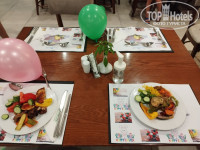 Еда в ресторане вкусная, разнообразная, много мясо, морепродуктов. Но на ужин надо приходить только в начале, потом скапливается очередь на входе потому что столиков не хватает. Официанты работаю хорошо. Но в ресторане постоянно нет стаканов, они только в баре и надо стоять очередь в бар чтоб только взять стакан и самому налить сок.