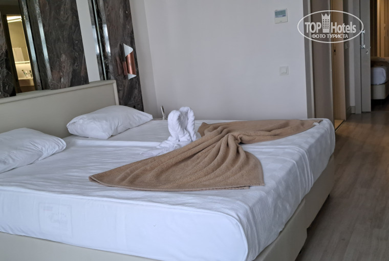 Приезжаем 3й раз и еще хотим)). Вкусная качественная еда: рыба, креветки, фрукты и овощи , сыров целый стол,выпечка выше всяких похвал, разные напитки , чистые удобные номера, водные горки, атркакционы для детей и взрослых включены. Очень комфортный отдых. Но надо учитывать 2 особенности данного отеля- очень активная анимация особенно вечером, слышно даже с закрытыми дверьми-нам не мешает, но это лучше знать заранее и вторая линия. Нас также не напрягало пройти до пляжа по зеленой территории соседнего отеля- но надо быть готовым)). Есть шатл- ездили пару раз буквально 5-7 мин. Но пешком было интереснее- по дороге минизоопарк с кроликами, кошками, гусями,голубями. В местной речушке, маленькой и немного заросшей, водятся пресноводные черепашки, с мостика, что ближе к пляжу, можно наблюдать за ними) Красивый садик с апельсинами и гранатами, все ухоженное, пройти приятнее, чем в микроавтобусе ехать. Персонал старается, уборка у нас в номере была очень хорошая, все менялось, пока мы были на завтраке, даже не понятно, как успевает. Молодцы!