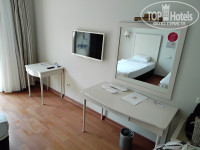 Кондиционер в номере еле дышит, но благо мы попадаем под погоду - ночью прохладно, а днем еще нет бешеной жары. Мебель беленькая, набор страноват, но стулья потом нашли себе сами на 3 этаже возле лифта. Постель чистая. Номер 2610 - это корпус В, 6й этаж и 10й номер - всего вроде 14 номеров на этаже. Лифт работает, но для такого количества людей маловато будет. Загрузка отеля уже почти полная. Ресторан справляется, но трудно им - персонала мало. Пищи хватает всем. Мне лично есть что и из чего выбрать. Мясо это индейка, курица, говядины мало и обычно в виде соуса с овощами. Рыба по качеству явно уступает египетской - скумбрия и почему-то очень твердая. Супы очень вкусные и даже есть на завтрак. Пищей очень довольна - много овощей, прилично приготовленного мяса, брынза, сыр, яблоки-груши, апельсины-грейфрут. Выпечка вкусная. Воды хоть залейся в холодильниках в ресторане в запечатанных стаканчиках по 200 грамм. Персонал вежливый. О вымогательстве чаевых нет даже и намека.